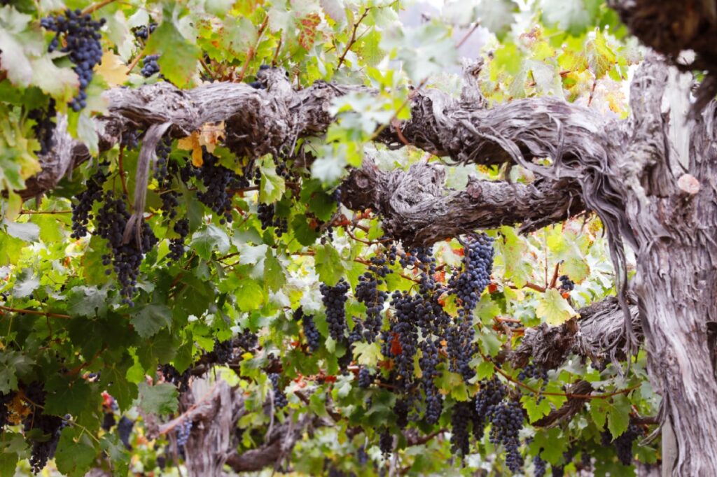Organic vineyards, with well-drained clay-loam soil and rocky material.